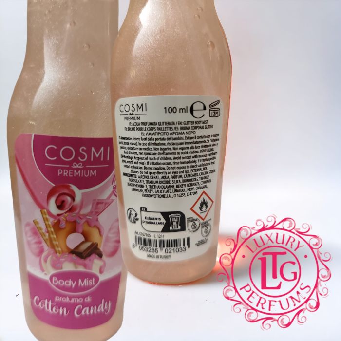 Sumérgete en la dulzura y la frescura con nuestro Body Mist de fragancia algodón de azúcar! Nuestra fórmula única combina la suave fragancia del algodón de azúcar con un toque de brillo sutil para que tu piel brille con cada aplicación. Este Body Mist ligero y refrescante es perfecto para añadir un toque de dulzura a tu rutina diaria. Rocía generosamente para disfrutar de una experiencia sensorial que te transportará a un mundo de dulces recuerdos. ¡Déjate envolver por la suave fragancia de algodón de azúcar y brilla todo el día!