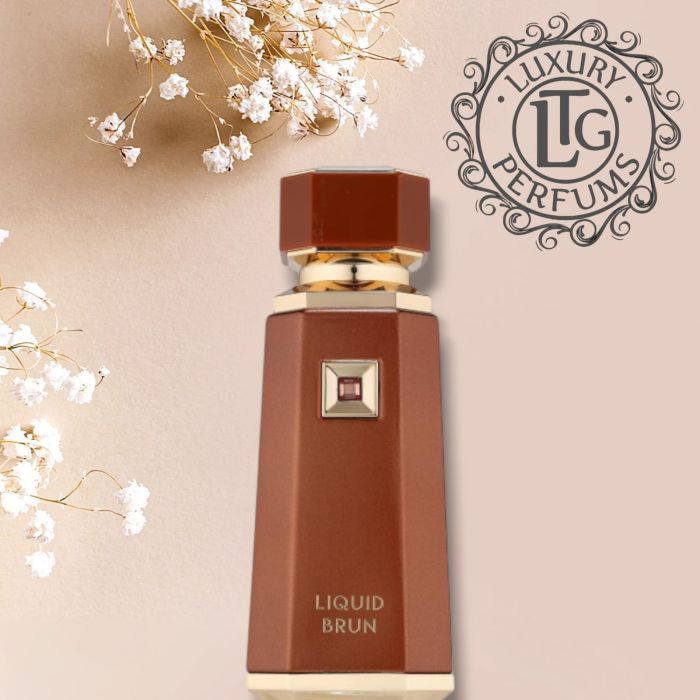 Finalmente, la base de Liquid Brun se asienta con una mezcla de almizcle, praliné, ambroxan y madera de guayaco. Estas notas aportan una calidez suave y duradera, dejando una estela envolvente que perdura en la piel. El resultado es un aroma que no solo se siente, sino que se recuerda, convirtiendo a Liquid Brun en un compañero ideal para el hombre que desea dejar una impresión duradera.