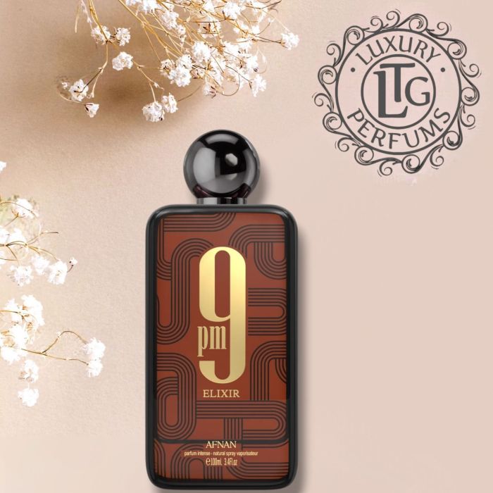 9PM Elixir de Afnan es una fragancia de la familia olfativa Oriental Especiada para Hombres y Mujeres. Las Notas de Salida son cardamomo, nuez moscada y elemí;