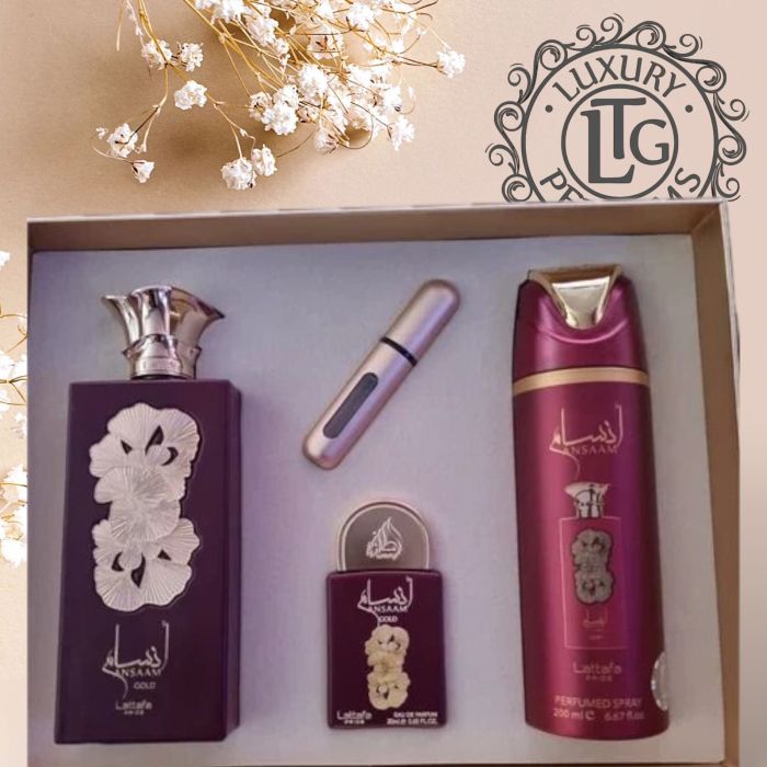 Set Ansaam Gold de Lattafa Perfumes es una fragancia de la familia olfativa Oriental Floral para Mujeres