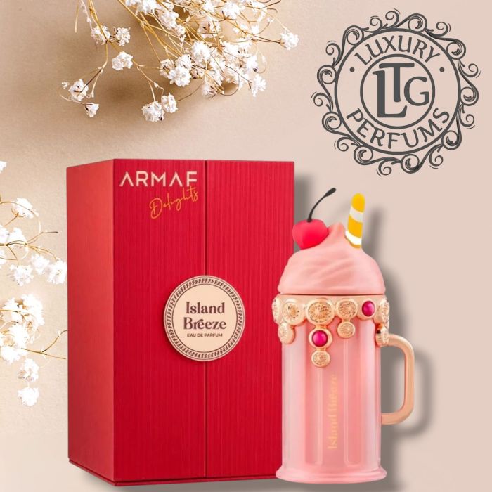 La presentación de Island Breeze es tan cautivadora como su aroma. La botella, con forma de cuenco de helado adornado con una cereza roja y una pajita amarilla, evoca la imagen de un postre tropical listo para ser disfrutado. Su tono rosa empolvado, combinado con un acabado dorado, refleja la esencia de las islas y las delicias gourmet, añadiendo un toque lúdico y lujoso a cualquier colección de fragancias.