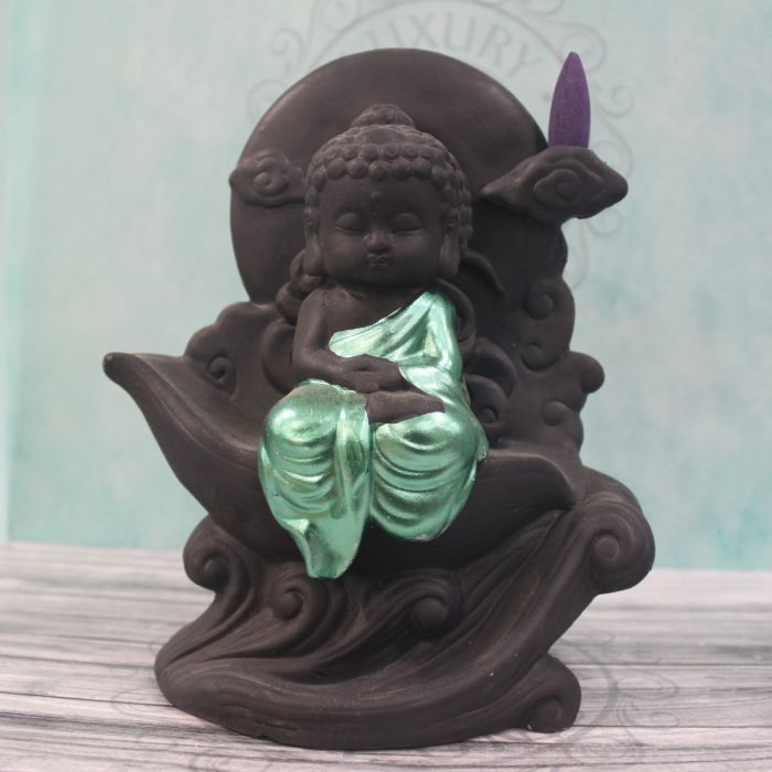 En la fuente, se encuentra un Buda sentado sobre una silla y toga verde metalizada, lo que agrega un toque de serenidad y tranquilidad al ambiente. El Buda es un símbolo de paz y armonía, lo que hace que esta fuente sea perfecta para cualquier espacio destinado a la meditación, el yoga o simplemente para relajarse después de un día agotador.