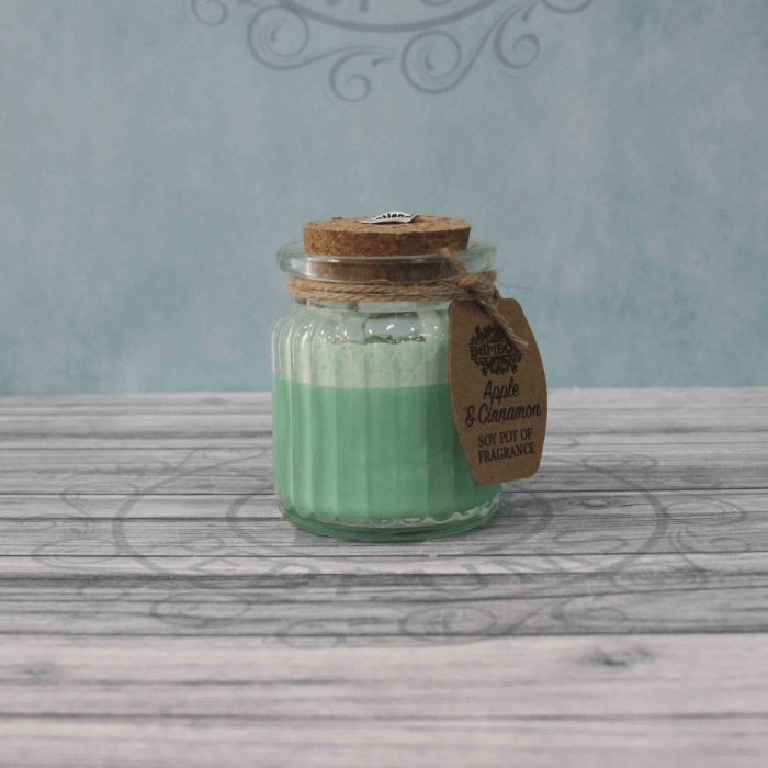 Velas de cera de soja con aroma a Manzana y Canela expuestas en frascos de vidrio reutilizables con tapón de corcho.
