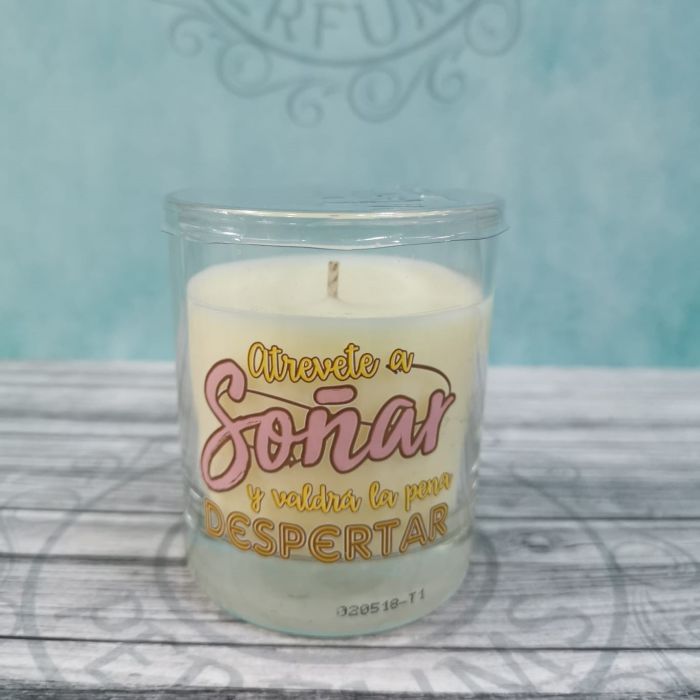 Vela aromática en vaso con mensaje para crear un ambiente, ideal como regalo.
