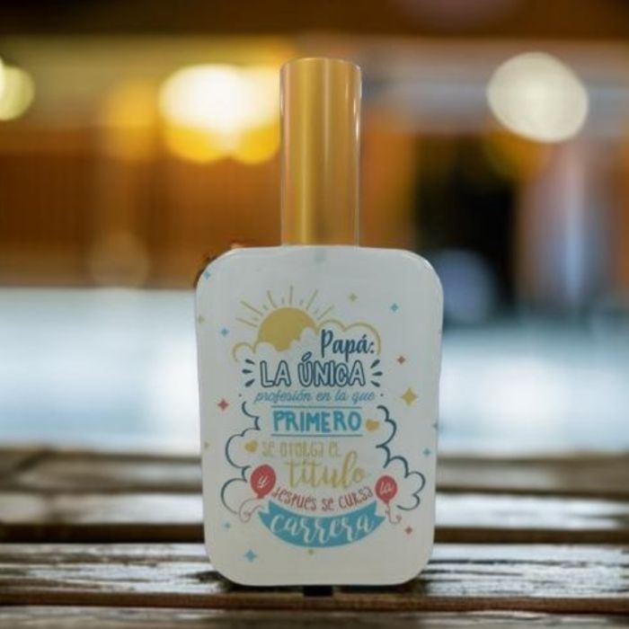 Perfume de 100 mililitros con personalización impresa directa sobre el envase. Modelo "PAPA, LA UNICA PROFESIÓN EN LA QUE PRIMERO SE OTORGA EL TITULO Y DESPUES SE CURSA LA CARRERA"