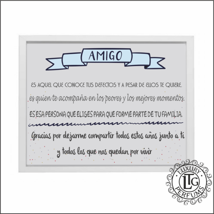 Cuadro lámina para un amigo especial enmarcada e impreso directamente por su interior en el cristal consiguiento un alto brillo en la imagen, frase dedicada a tu mejor amigo ideal para regalar en algún evento. El cuadro es válido para colgar o colocar de pie