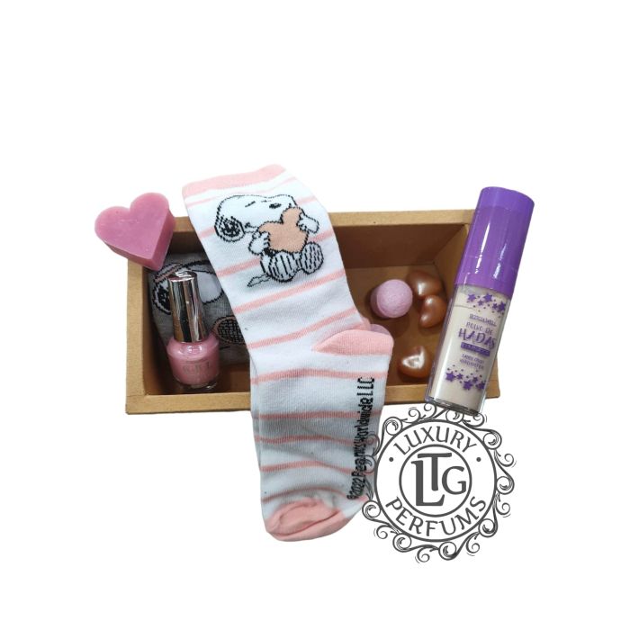 Si estás buscando una caja de regalo para los fans de snoopy, tenemos la opción perfecta para ti! Nuestra caja de regalo, incluye dos juegos de calcetines para adultos del tan genial Snoopy, así como un jaboncito en forma corazón, un iluminador Polvo de Hadas, pintura de uñas y bombas/aceite para tu bañera. ¡Es el regalo ideal para cualquier fanático de Snoopy! Además, la caja de regalo es elegante y sofisticada, lo que la hace perfecta para cualquier ocasión. ¡No esperes más y sorprende a tus seres queridos con este increíble pack de regalo!